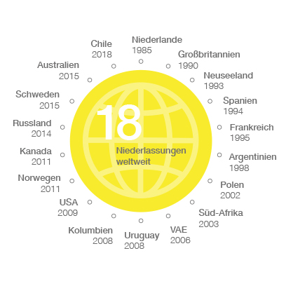 Internationale Expansion mit Tochtergesellschaften und Vertriebspartnern. Erst nur innereuropäisch, dann mit Vertretungen in aller Welt.